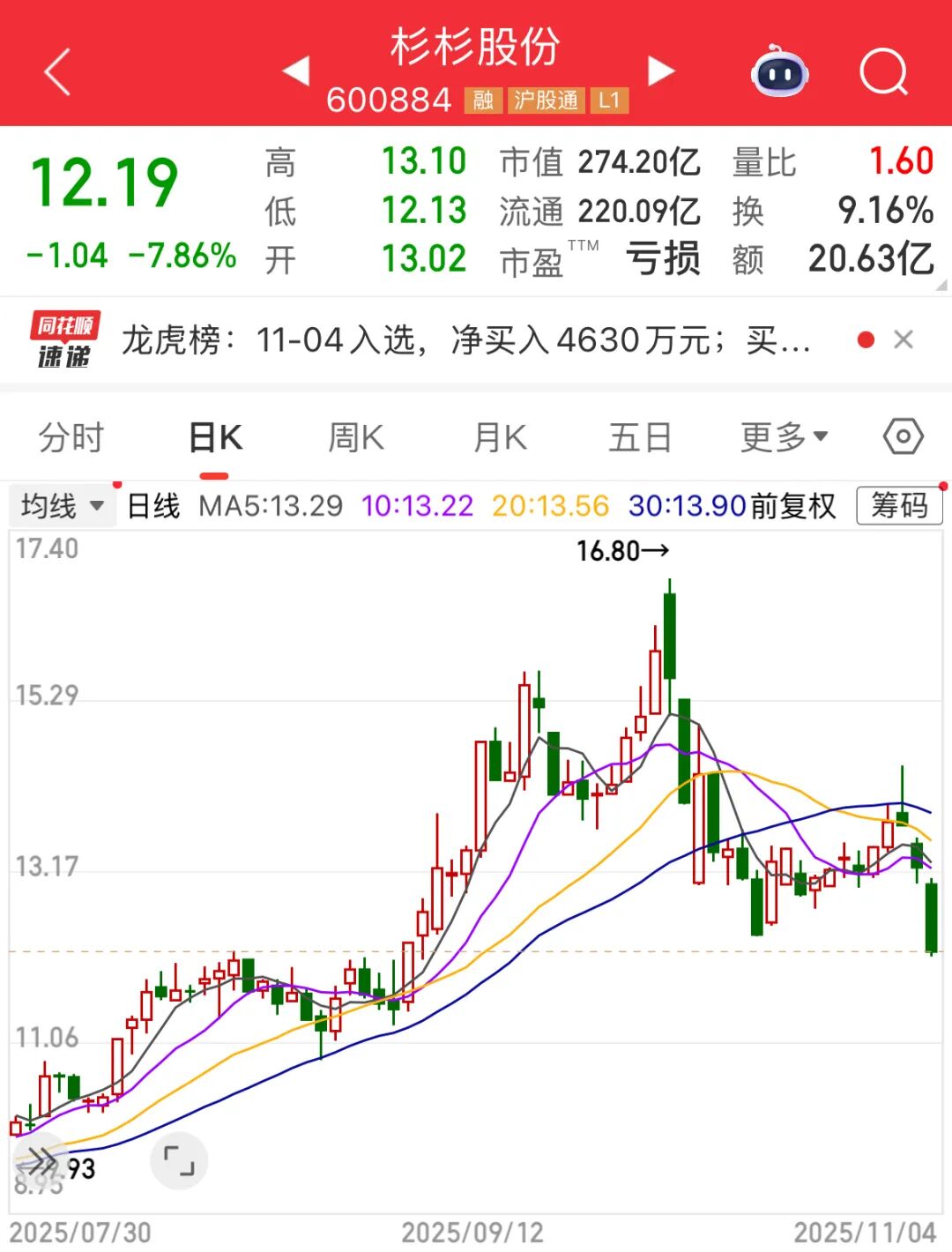 11月4日,杉杉股份报收12.19元/股,跌幅7.86%优选策略,总市值为274.2亿元。