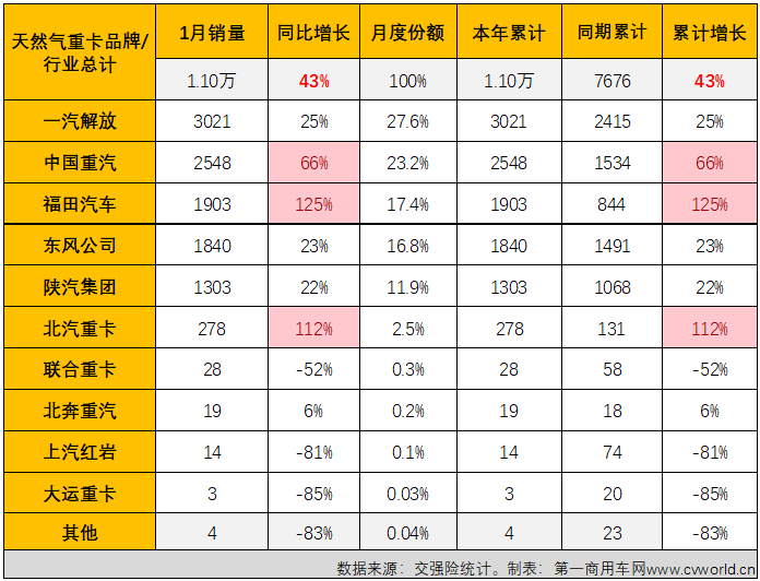 上表可见,2026年1月份,天然气重卡市场整体销量同比增长43%,主流企业有增有降,1月份销量前十企业7增3降。1月份,天然气重卡销量排行前6企业均实现增长,其中重汽、福田和北汽重汽同比分别增长了66%、125%和112%,增幅高于市场整体增速,跑赢市场“大盘”;解放、东风和陕汽同比实现两位数增长,北奔同比小增6%。与此同时,下滑的几家企业降幅均达到两位数,下滑最严重的企业1月份销量同比下降了85%。
