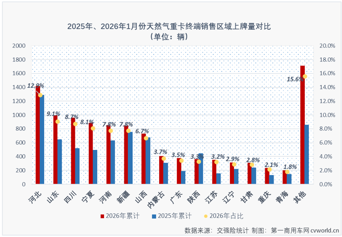 从终端销售区域来看,2026年1月份,全国31个省级行政区都有天然气重卡挂牌上路,区域分布仍呈现出极不均衡的状态,河北、山东、四川、宁夏、河南、新疆排名2026年1月份天然气重卡终端销量前六(如下图),排名首位的河北占比达到12.9%,山东、四川、宁夏、河南、新疆占比分别为9.1%、8.7%、8.1%、7.8%和7.8%。