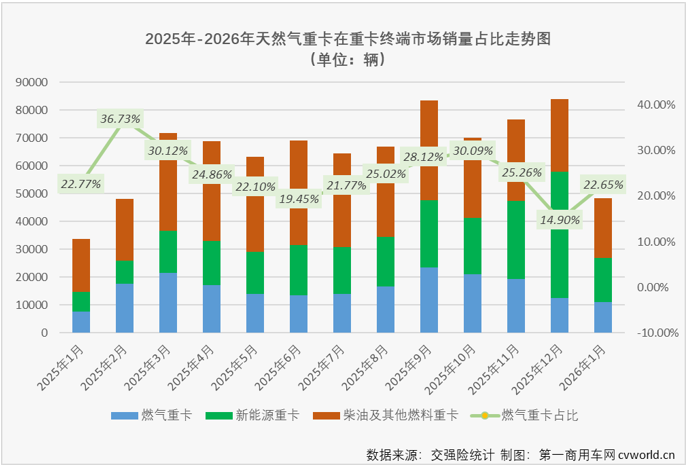1月份,重卡市场整体实销4.84万辆,同比增长44%,天然气重卡1月份同比增长43%,增幅略低于重卡市场整体增速。1月份,天然气重卡1.1万辆的销量在重卡终端实销中占到22.65%的份额,较上月(14.90%)提升接近8个百分点(如上图),较2025年全年占比(24.83%%)则小幅下滑。