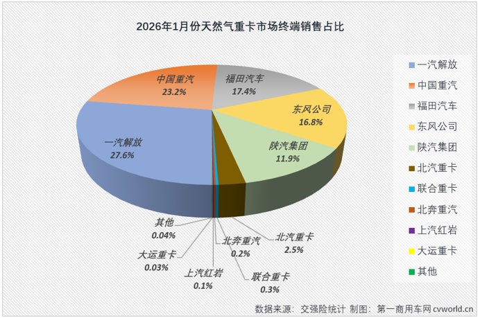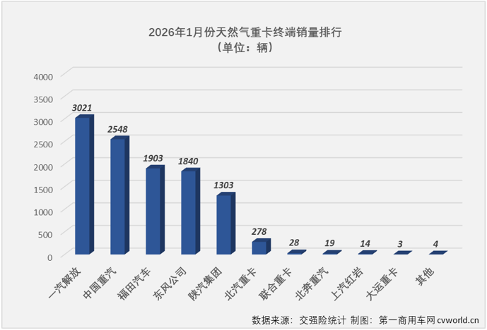 2026年1月份,天然气重卡市场有5家企业销量超1000辆,解放销售3021辆,继续蝉联天然气重卡月销量榜冠军;重汽销售2548辆排名次席;福田、东风和陕汽分别销售1903辆、1840辆和1303辆,相邻企业差距不大。