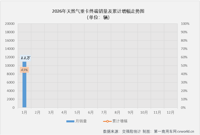 2026年1月份,国内天然气重卡实销1.1万辆,同比增长43%,比2025年1月份多销售3200余辆。