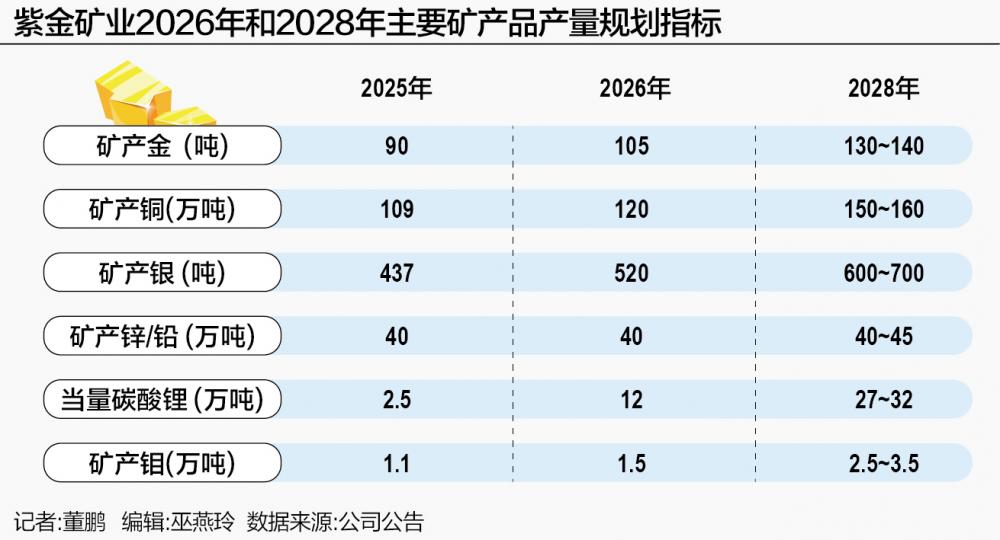 根据紫金矿业2026—2028年主要矿产品产量规划,公司计划到2028年将矿产金产量进一步提升至130—140吨,135吨的规划产量中位数相当于较2025年再增50%。
